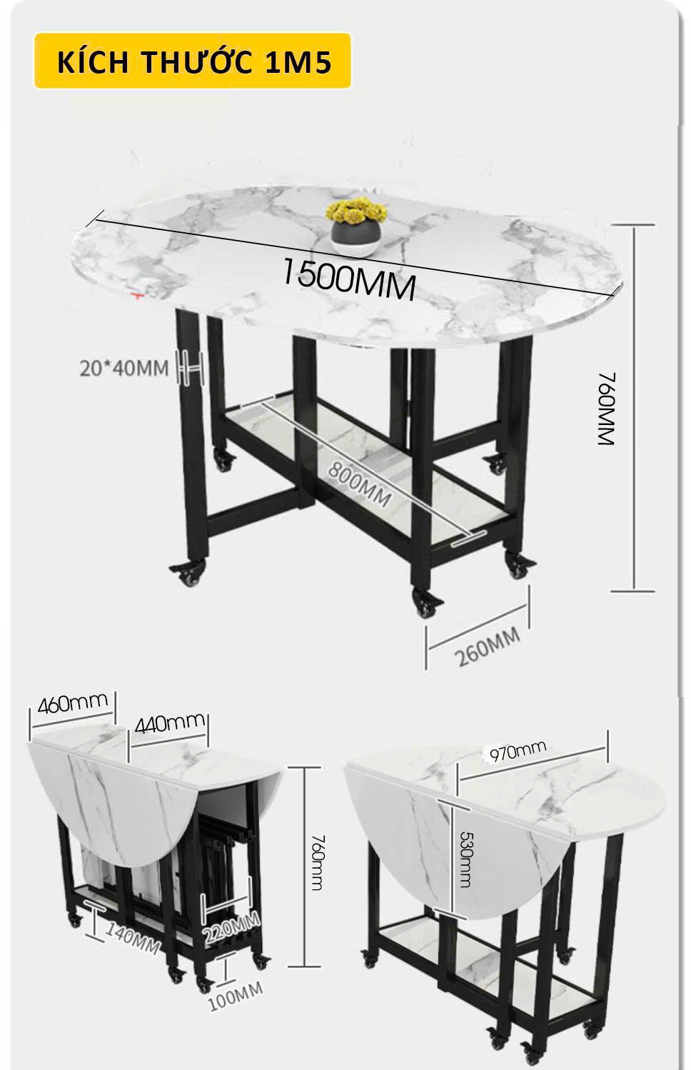Khi bàn gập lại sẽ giúp tiết kiệm không gian tối đa, 1 khoảng không thông nhau bên dưới gầm bàn sẽ được tận dụng để lưu trữ ghế ngồi khi không sử dụng, có thể chứa được 4 chiếc ghế.