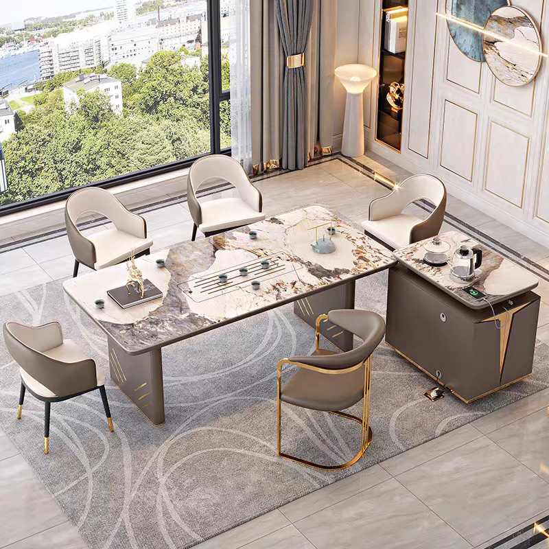 - Bàn mặt đá kết hợp khung kim loại mang lại vẻ sang trọng, bền bỉ.