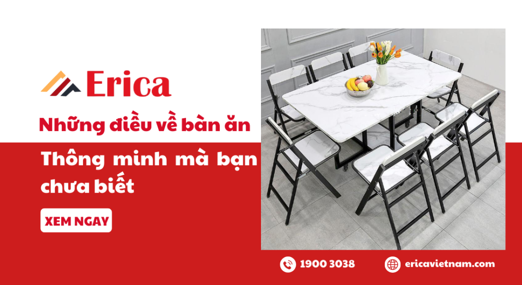 Bàn ăn thông minh không chỉ giúp tiết kiệm diện tích mà còn mang lại sự tiện lợi và thẩm mỹ vượt trội. Với những gợi ý trên, hy vọng bạn có thể dễ dàng chọn được mẫu phù hợp với nhu cầu gia đình mình. Nếu bạn đang tìm nơi uy tín để tham khảo thêm các mẫu thiết kế, đừng quên ghé thăm Nội Thất Erica để xem những bộ bàn chất lượng, đa dạng phong cách và luôn cập nhật xu hướng mới.