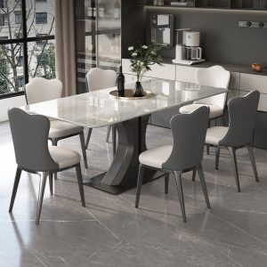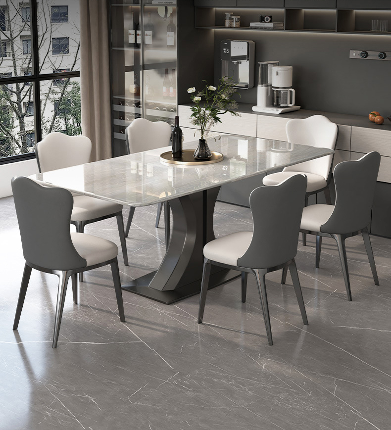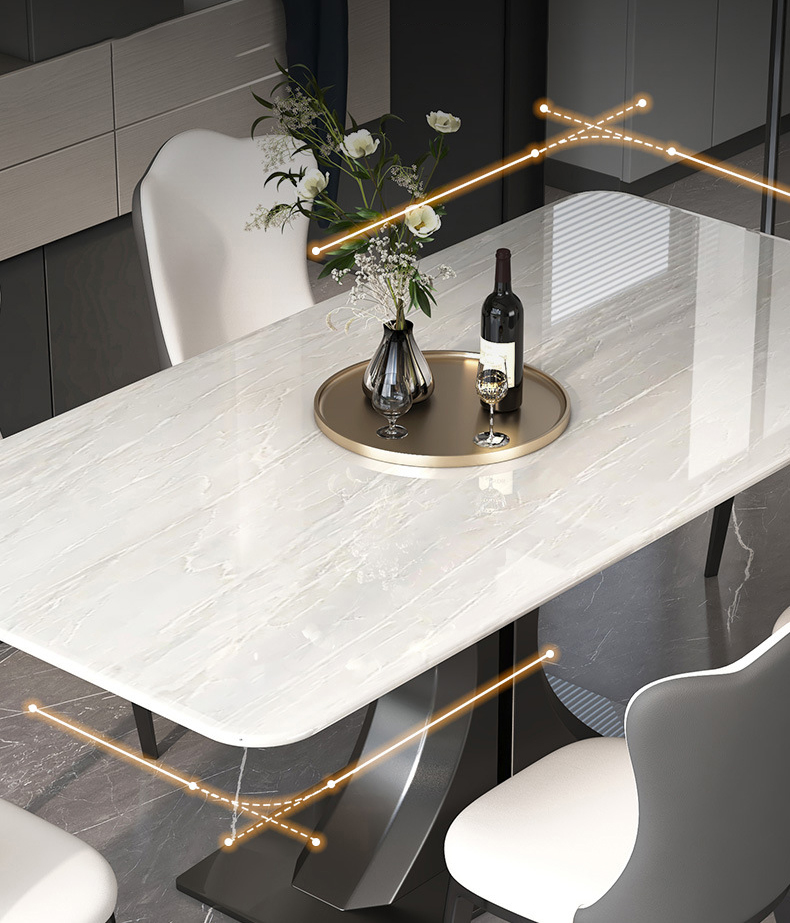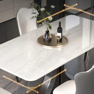 Phần mặt bàn ăn cơm được chế tác từ đá cẩm thạch tự nhiên, mang vẻ đẹp riêng biệt với những đường vân tinh xảo và độ bóng mịn sang trọng. Đây là chất liệu không chỉ chinh phục người nhìn bằng giá trị thẩm mỹ vượt thời gian mà còn nổi bật với độ bền cao, khả năng chống trầy xước và dễ dàng vệ sinh – đảm bảo duy trì vẻ đẹp tinh khôi qua nhiều năm sử dụng.