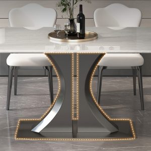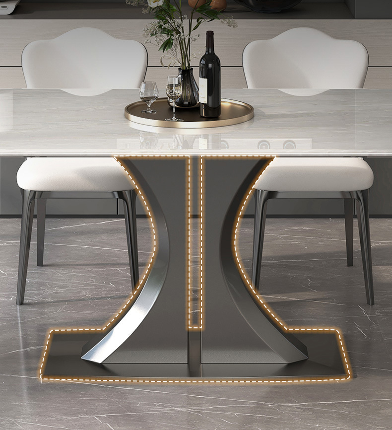Phần chân bàn bằng thép không gỉ được xử lý tỉ mỉ, tạo nên kết cấu vững vàng và khả năng chống ăn mòn ưu việt. Thiết kế chân bàn mang đường cong mềm mại, mang đến cảm giác cân đối, hài hòa và đầy tính nghệ thuật. Chính sự kết hợp giữa độ bền và nét thanh thoát này giúp bàn trở thành điểm nhấn hoàn hảo cho không gian sống hiện đại.