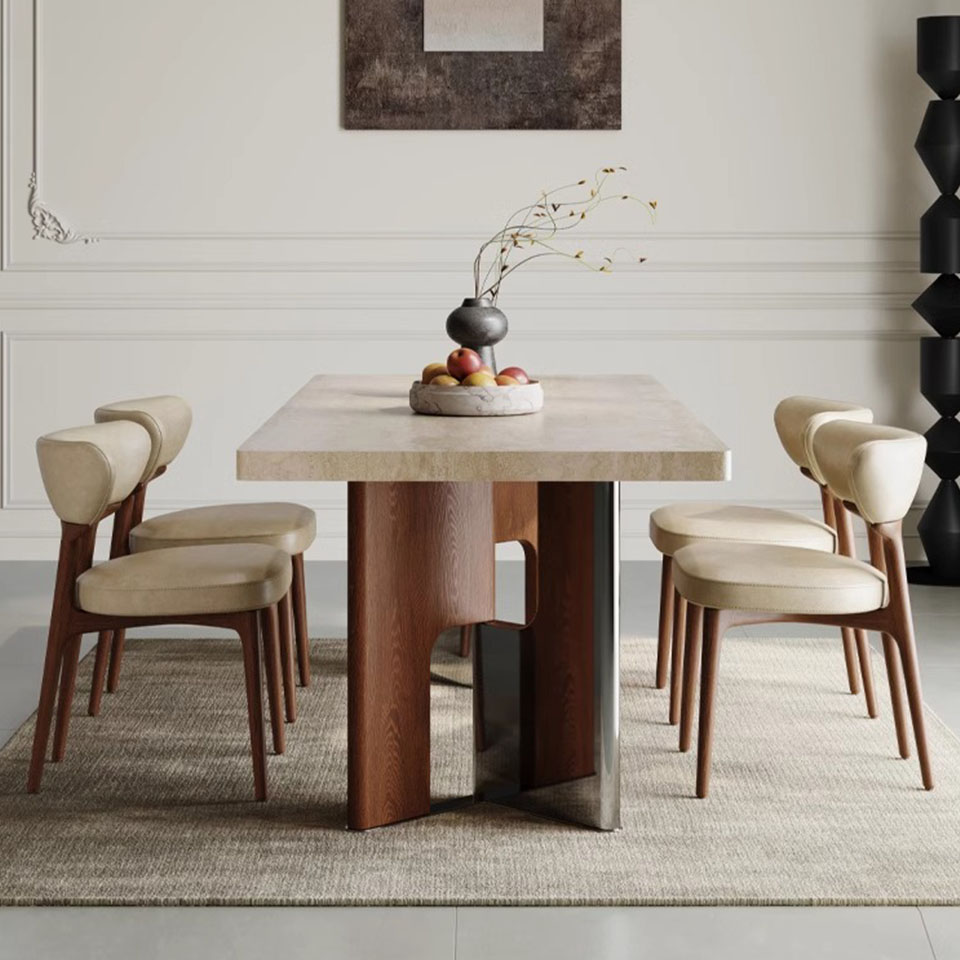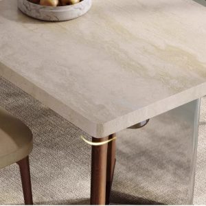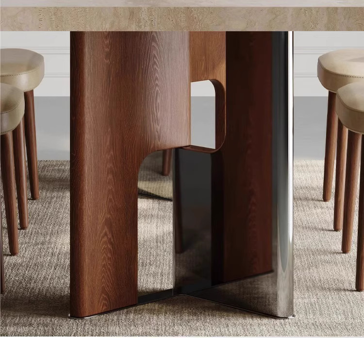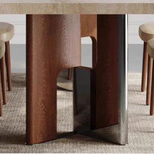 Phần chân bàn là sự kết hợp hoàn hảo giữa gỗ tự nhiên và thép không gỉ đánh bóng gương, tạo nên điểm nhấn độc đáo cho tổng thể. Kết cấu chắc chắn, tỉ lệ cân đối cùng từng chi tiết được hoàn thiện tỉ mỉ giúp bàn ăn Erica không chỉ vững chãi mà còn giữ được nét sang trọng, tinh tế theo thời gian.