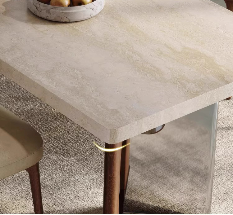 Mặt bàn được chế tác từ đá ép cao cấp, loại vật liệu hiện đại được tạo nên từ bột đá tự nhiên kết hợp khoáng chất và keo chuyên dụng, mang lại kết cấu chắc chắn và vẻ đẹp hài hòa. Nhờ công nghệ ép tiên tiến, bề mặt sở hữu vân đá tự nhiên tinh tế, cảm giác mịn màng và màu sắc đồng nhất, tạo nên sự sang trọng nhưng vẫn dễ chịu khi chạm vào. Bề mặt đá ép cũng được xử lý cẩn thận để tăng khả năng chống thấm, hạn chế bám bẩn và dễ dàng vệ sinh, mang đến sự tiện nghi tối ưu trong quá trình sử dụng.