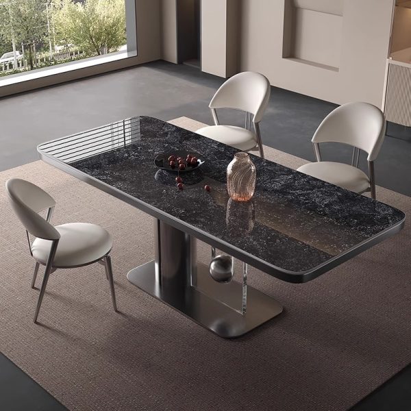 Mặt bàn sử dụng chất liệu đá phiến cao cấp với khả năng chống trầy xước, chịu nhiệt và kháng khuẩn hiệu quả, giúp duy trì vẻ sáng bóng trong suốt quá trình sử dụng. Phần khung và chân bàn được chế tác từ thép không gỉ cao cấp, mang đến sự chắc chắn và ổn định tuyệt đối, đồng thời tạo nên điểm nhấn sang trọng cho không gian.