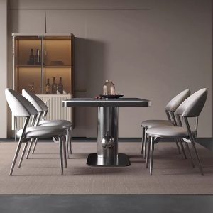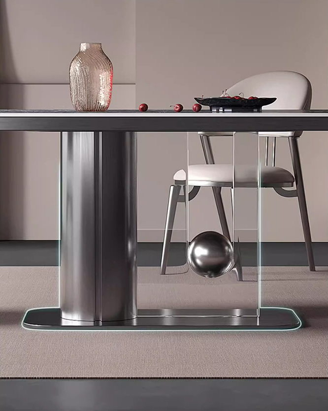 Không chỉ là một món nội thất, bộ bàn ăn mặt đá còn là tuyên ngôn phong cách sống – nhẹ nhàng, tinh tế nhưng vẫn toát lên khí chất đẳng cấp. Tạo hình chân bàn mang hơi thở nghệ thuật đương đại, kết hợp giữa hình khối mạnh mẽ và chi tiết kim loại thanh lịch, mang đến vẻ đẹp cân bằng giữa hiện đại và nghệ thuật.
