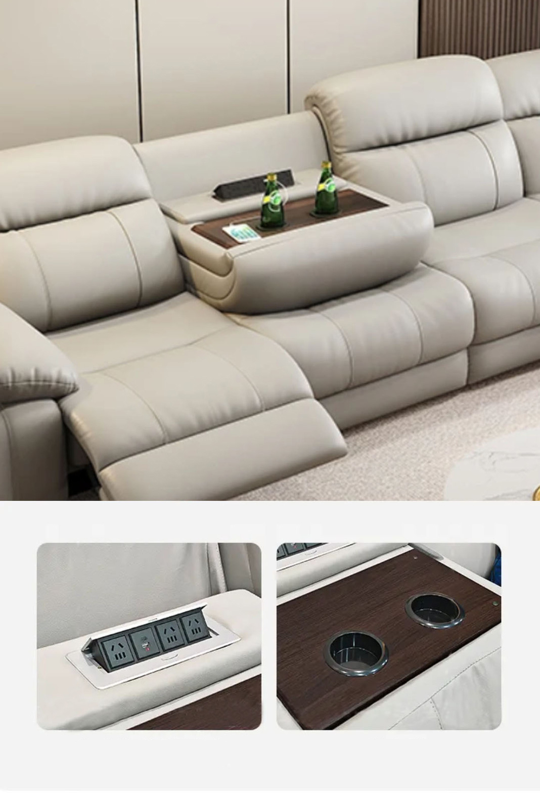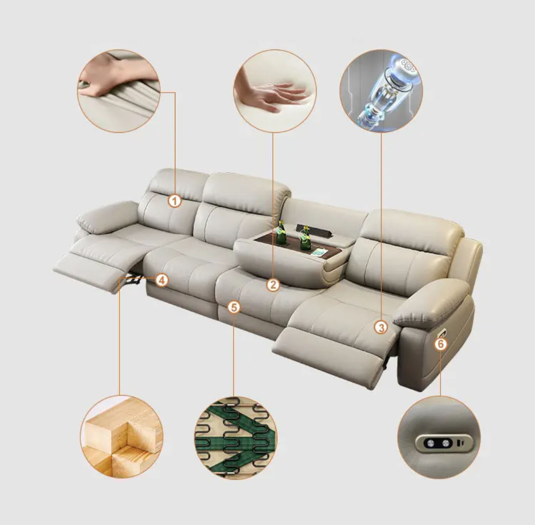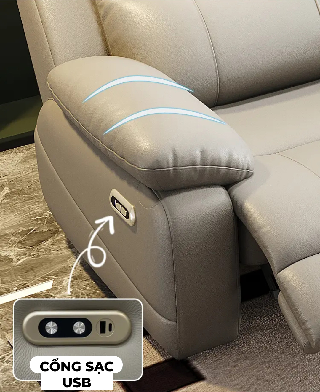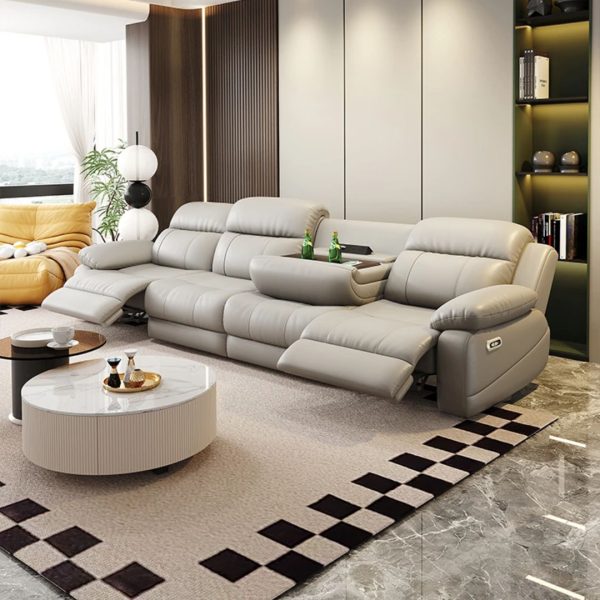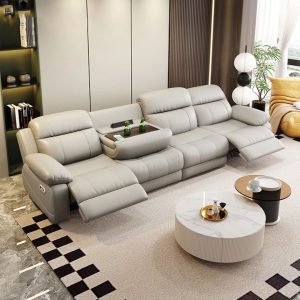 Chỉ với một thao tác gập nhẹ phần tựa lưng trung tâm, chiếc ghế ngay lập tức biến thành bệ tì tay sang trọng với khay để cốc và ổ cắm điện tích hợp. Người dùng có thể vừa thưởng thức đồ uống, vừa sạc điện thoại hoặc laptop một cách tiện lợi – biến ghế sofa thành không gian thư giãn và làm việc hoàn hảo.