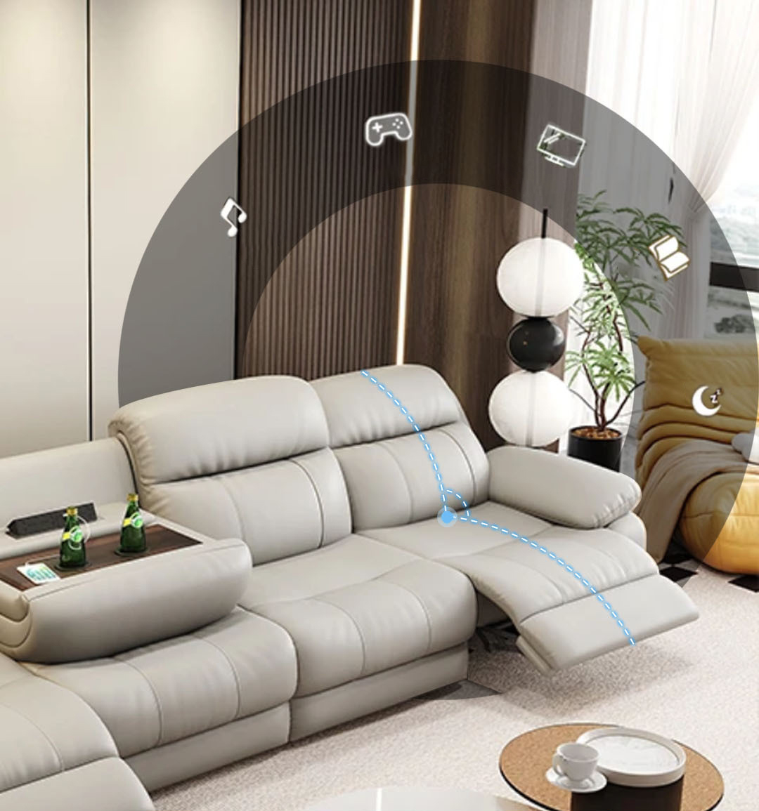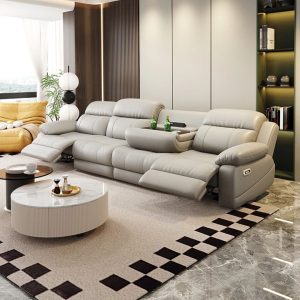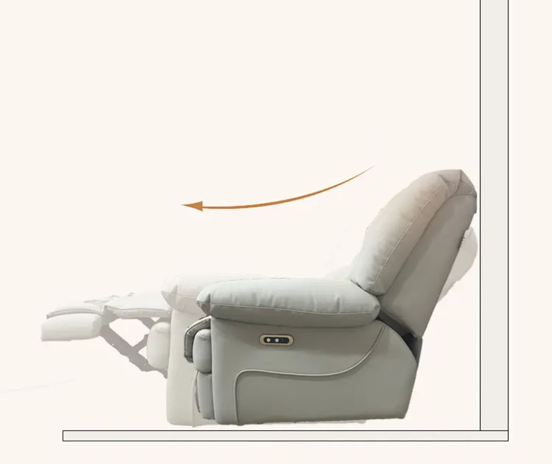 Sofa được ứng dụng cơ chế ngả trượt thông minh, cho phép phần thân ghế tự động trượt về phía trước khi ngả, giúp không cần chừa khoảng cách với tường. Giải pháp “0 cm dựa tường” này vừa tiết kiệm diện tích, vừa giữ cho không gian phòng khách gọn gàng, tinh tế – lý tưởng cho căn hộ hiện đại có diện tích giới hạn.