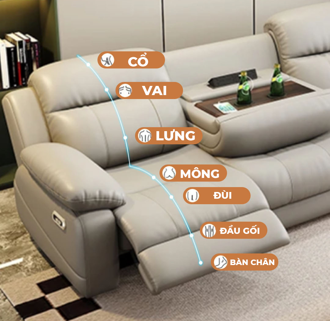 Dù bạn muốn ngồi đọc sách, xem phim, đánh một giấc ngắn hay tận hưởng âm nhạc, sofa đều có thể điều chỉnh góc nghiêng phù hợp chỉ bằng một chạm nhẹ. Ghế giúp giải phóng áp lực vùng cổ – vai – lưng, ngăn đau mỏi và mang đến cảm giác thư giãn trọn vẹn như tại spa.