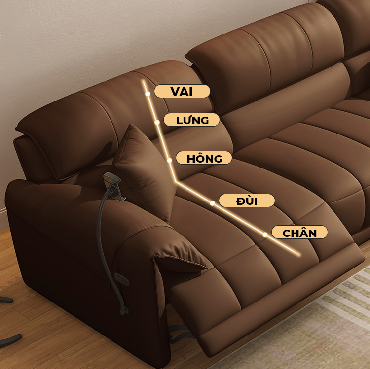 - Ngả lưng chỉnh điện với cơ chế điều khiển linh hoạt, cho phép người dùng tùy chỉnh độ nghiêng theo ý muốn, mang đến cảm giác thư giãn tối đa sau mỗi giờ làm việc hoặc khi nghỉ ngơi.
