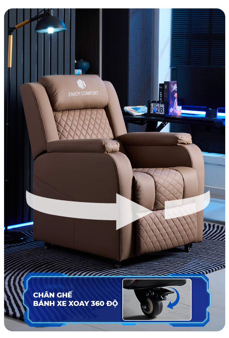 Tích hợp chức năng ngả lưng tự động, ghế giúp người dùng dễ dàng thay đổi tư thế chỉ với một thao tác nhẹ. Từ ngồi đọc sách, xem phim cho đến nằm nghỉ, mọi chuyển động đều êm ái – mượt mà – không gây tiếng ồn, đem lại trải nghiệm thư giãn toàn diện sau một ngày dài làm việc.