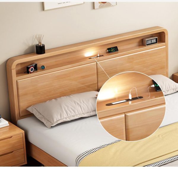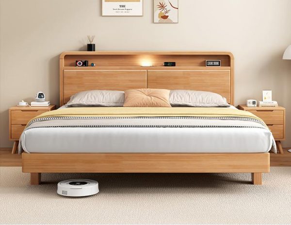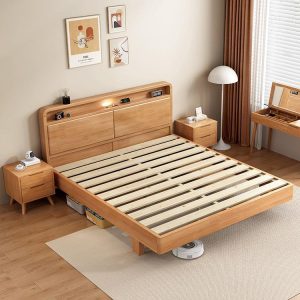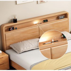 Thiết kế thông minh với khoảng trống gầm giường thoáng rộng, dễ dàng vệ sinh và có thể tận dụng làm không gian lưu trữ tiện lợi. Phần tựa đầu giường tích hợp hộc để đồ nhỏ gọn, giúp người dùng có thêm nơi sắp xếp sách, đồng hồ hay vật dụng cá nhân một cách ngăn nắp.