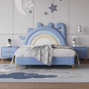 Khung giường được chế tác từ gỗ thông Nga nhập khẩu, bền chắc và an toàn cho trẻ em. Bề mặt được phủ vỏ đệm da mềm mại, mang lại cảm giác thoải mái và sang trọng khi sử dụng.
