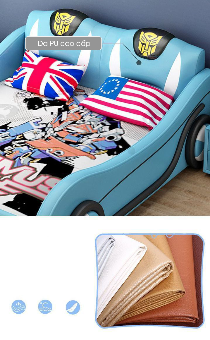 Sản phẩm được bọc da cao cấp mềm mịn, dễ vệ sinh, an toàn cho làn da nhạy cảm của trẻ. Khung giường cho bé được chế tác từ gỗ thông nhập khẩu Nga, nổi tiếng về độ bền chắc và khả năng chịu lực vượt trội, mang lại sự vững chãi trong suốt quá trình sử dụng.