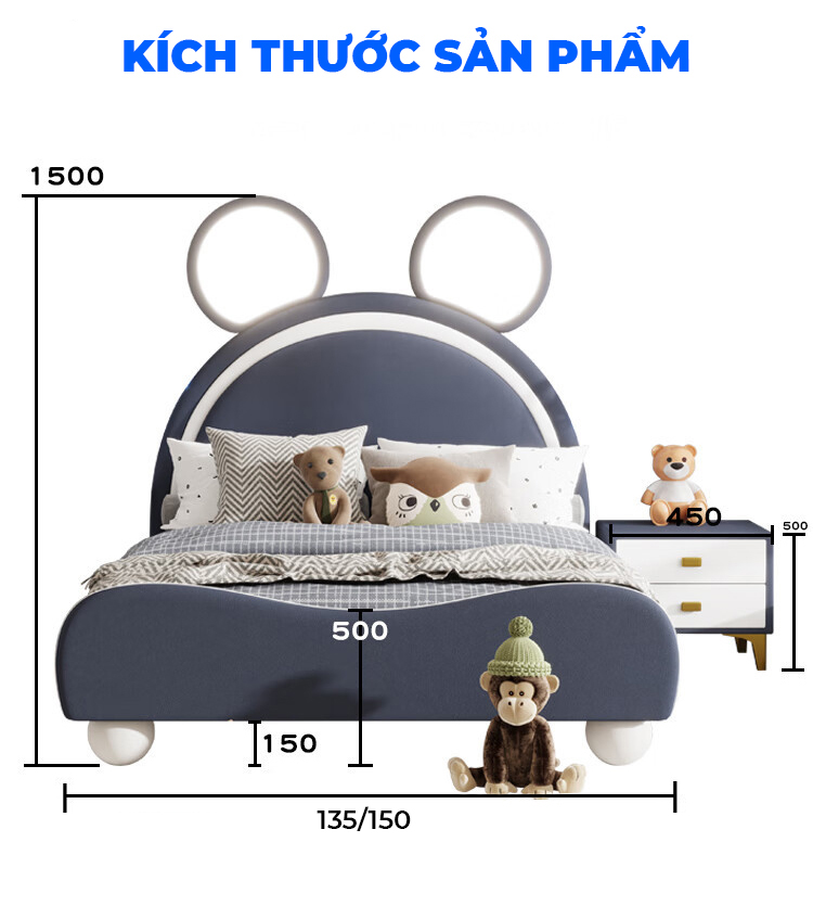 Giường Ngủ trẻ em Hình Mickey ODGN23 là mẫu giường cao cấp thiết kế dành cho trẻ em hoặc cho không gian mang phong cách dễ thương, hiện đại. Sản phẩm kết hợp giữa chất liệu da tổng hợp bọc bền đẹp, khung gỗ thông nhập khẩu và chi tiết đèn LED tinh tế ở phần đầu giường tạo nên điểm nhấn riêng, vừa tiện nghi vừa bắt mắt.