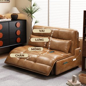 Sản phẩm nội thất đẳng cấp này sở hữu thiết kế với 6 chức năng trong 1: Sofa ngồi, sofa thư giãn, giường ngủ, bàn trà/bàn làm việc, bàn ăn và tủ đựng đồ. Chỉ với vài thao tác đơn giản, bạn có thể biến hóa không gian của mình nhanh chóng, đáp ứng mọi nhu cầu sử dụng. Thiết kế sofa kết hợp giường này sẽ mang đến sự tiện lợi và thú vị cho cuộc sống của bạn..