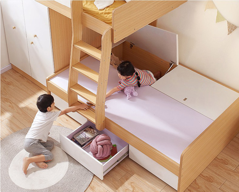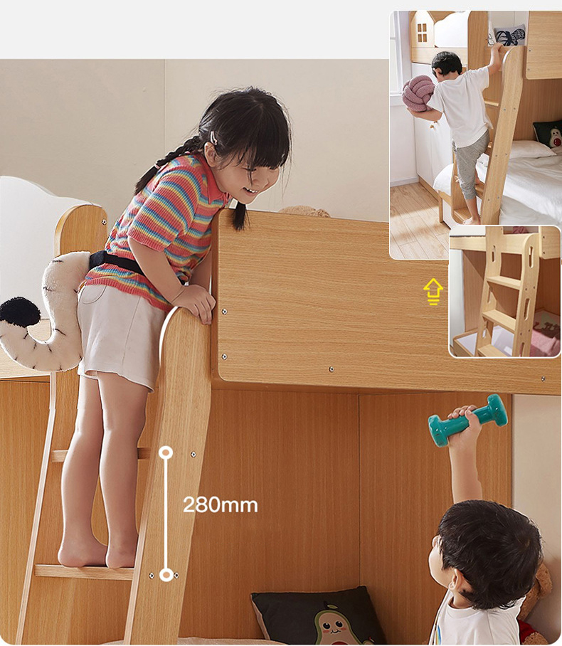 - Giường tầng dưới có thiết kế thấp, rộng rãi, thuận tiện cho bé nhỏ sử dụng.