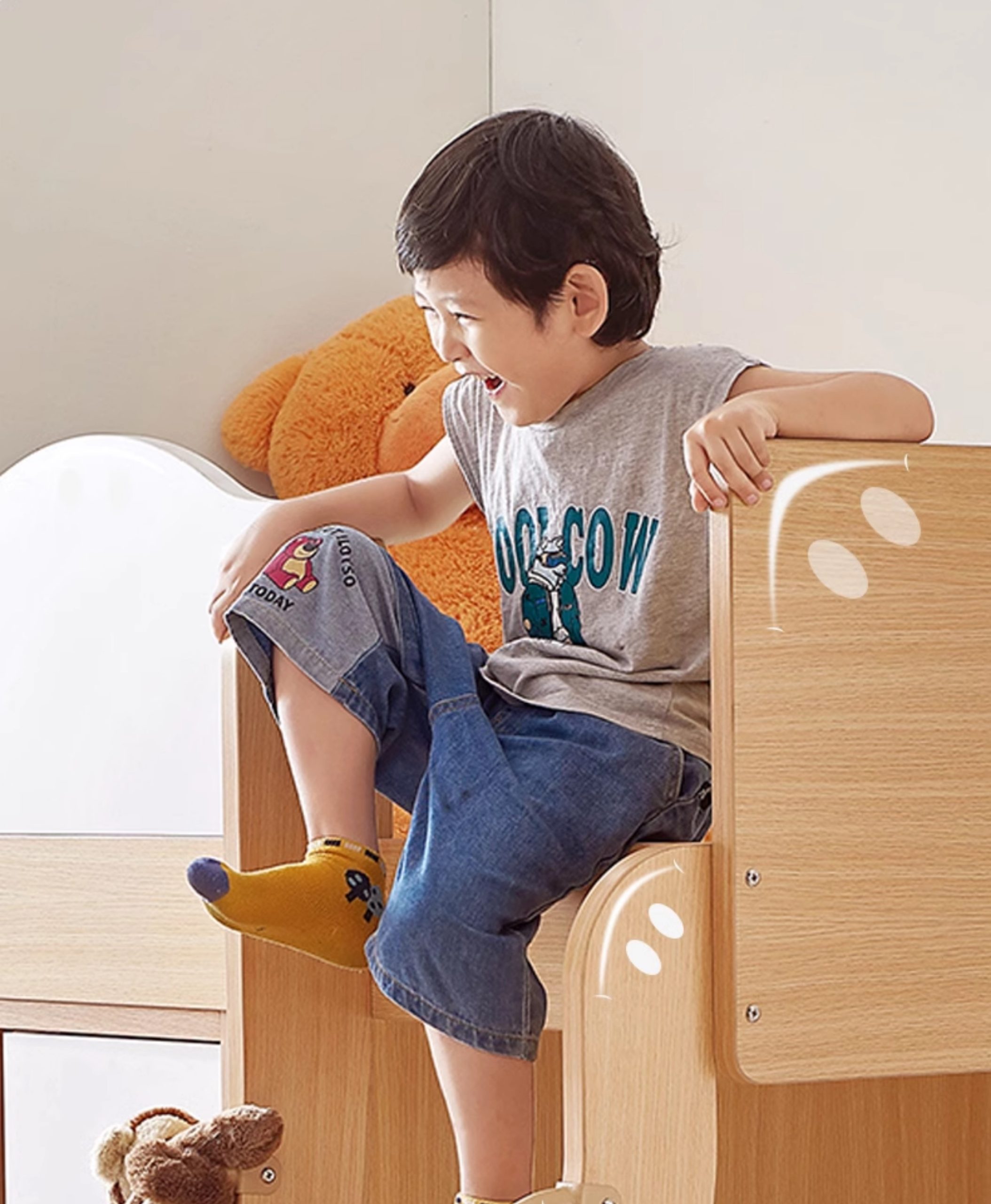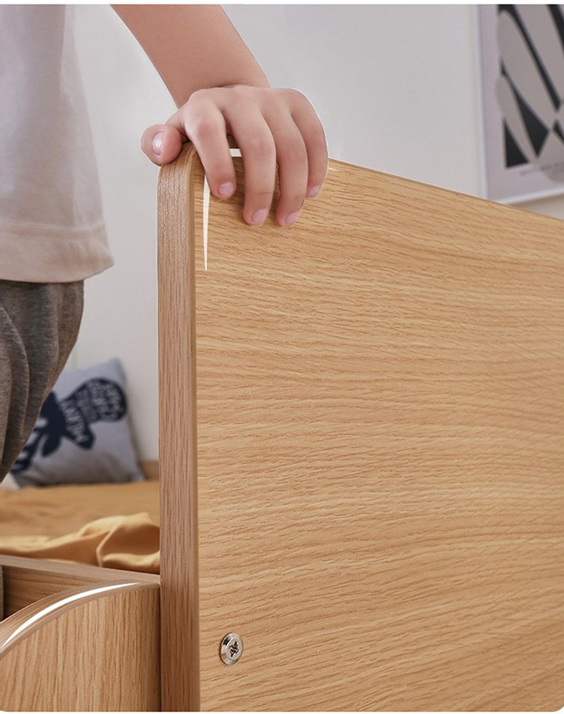 - Toàn bộ các cạnh giường, tủ, cầu thang và kệ đều được bo tròn, giúp hạn chế trầy xước và chấn thương khi bé vui chơi.