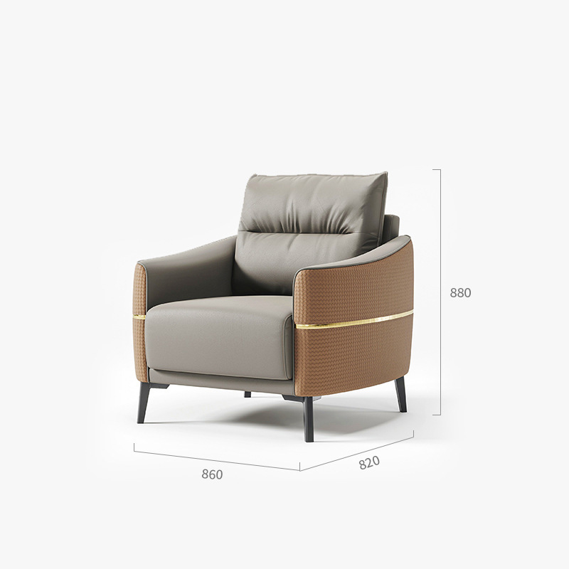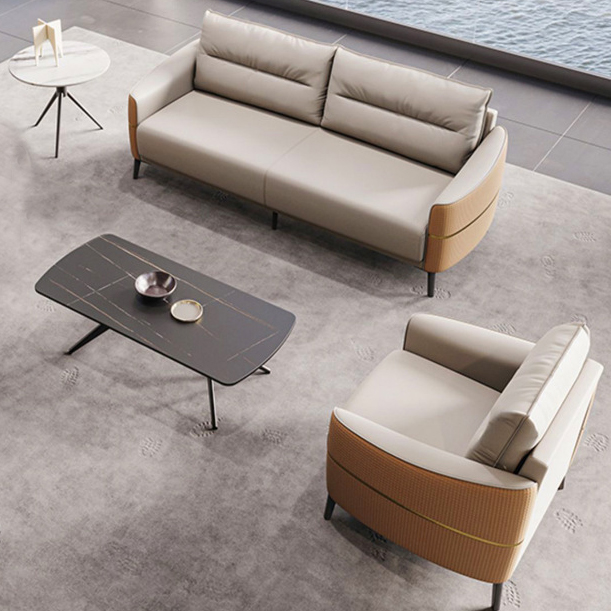 Màu sắc chủ đạo của sofa là ghi sáng trung tính, kết hợp tinh tế với phần tay vịn nâu da bò ánh cam, bộ sofa màu ghi xám mang lại một vẻ ngoài quý phái nhưng không quá lạnh lùng, phù hợp với nhiều tông nền nội thất. Do vậy, dù đặt trong bất kỳ không gian nào, sản phẩm đều dễ dàng hòa nhập và nâng tầm thẩm mỹ không gian.